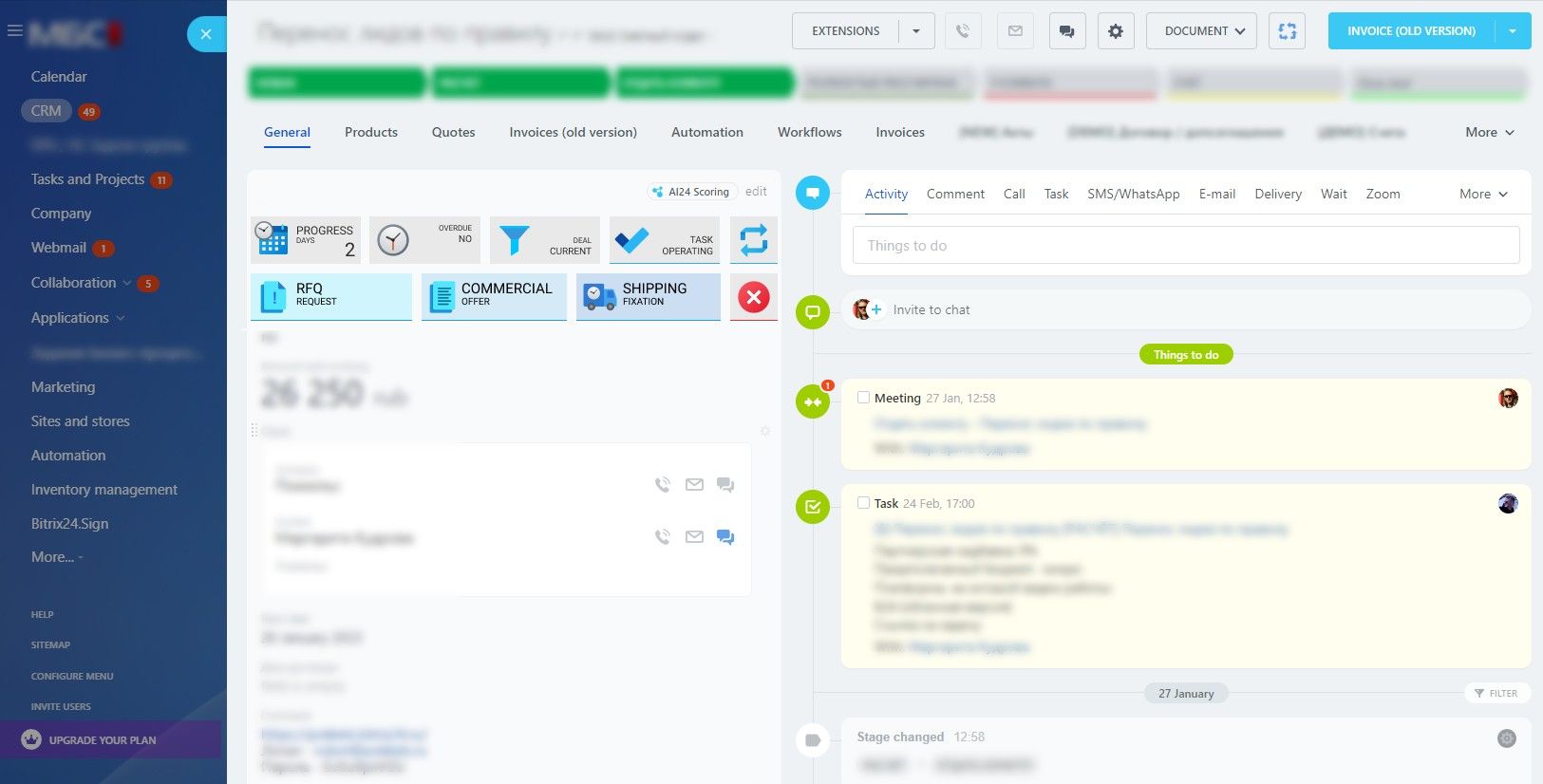 Each element is interactive, displays current state of the entities of the deal and contains hyperlinks. There are two buttons on the right: for quickly updating the data and for moving the deal to “failure”. Yes, the latter is sad, but it's just one of the little things too!
